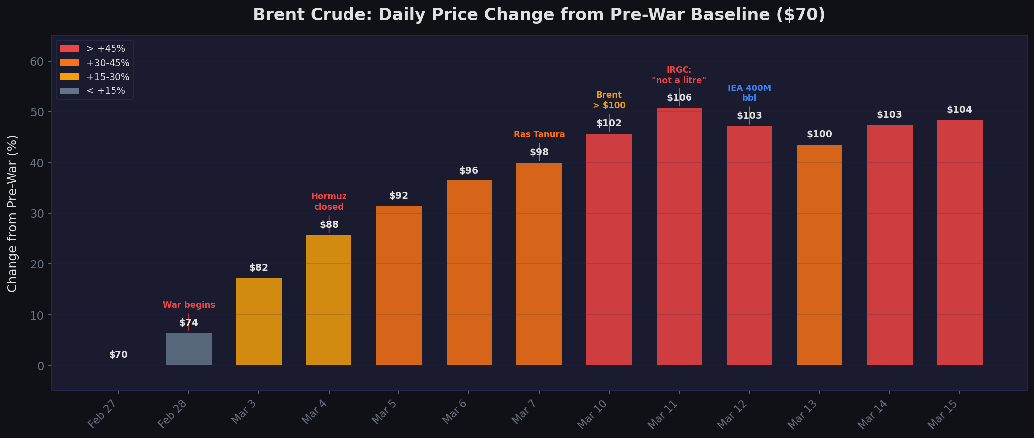 Figure 1: Daily Brent crude prices from February 27 to March 15, 2026, showing the escalation from $70 pre-war to