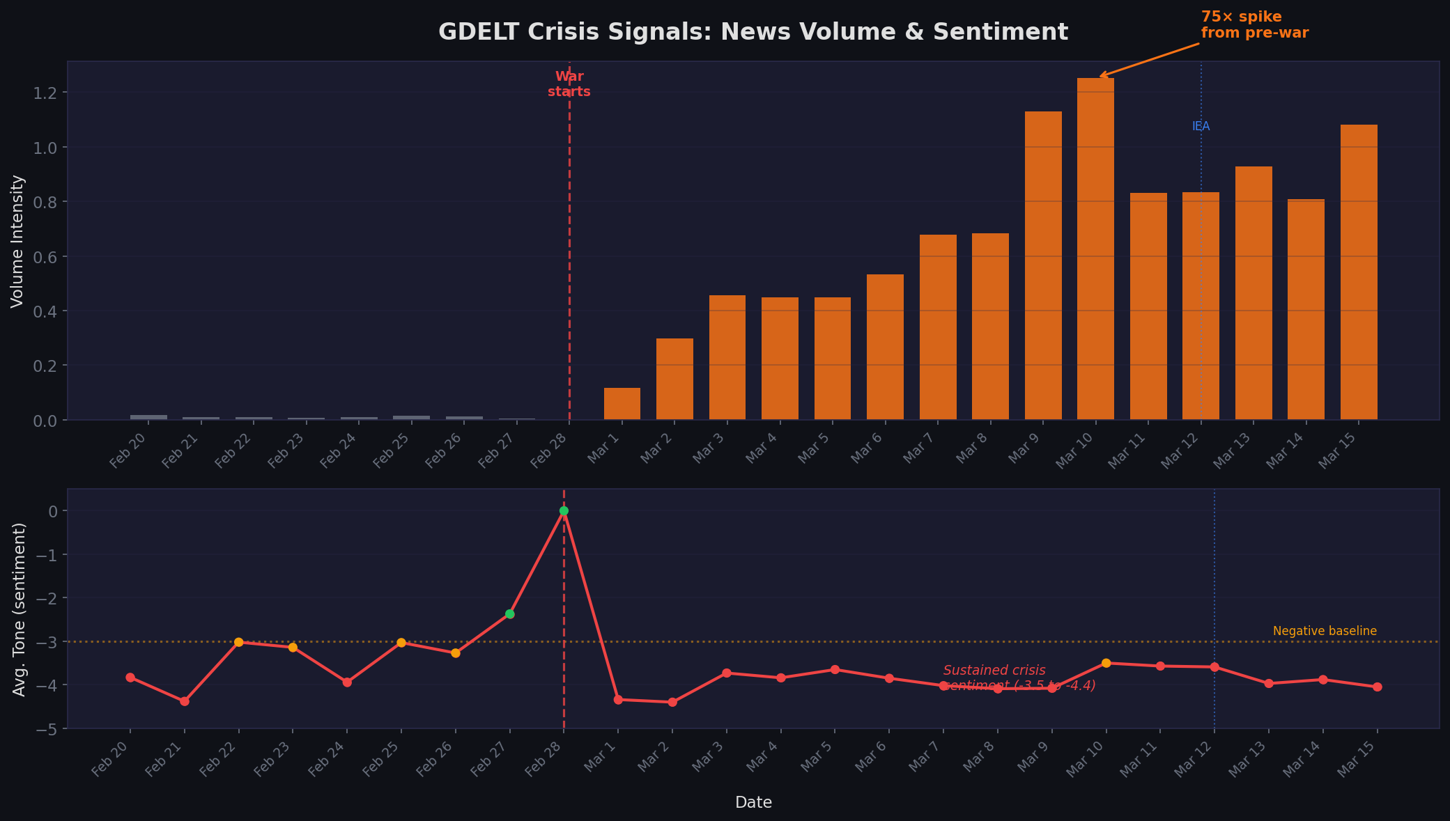 Figure 3: GDELT DOC 2.0 API data showing the 75x news volume spike (top) and sustained negative sentiment tone (bottom). The red dashed line marks the war start; the blue dotted line marks the IEA release.