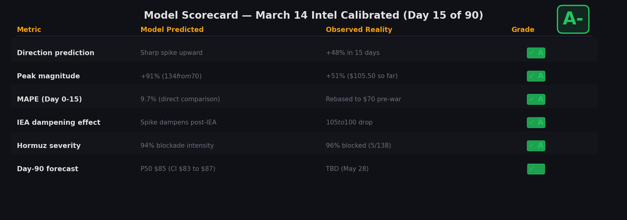 Figure 5: Model scorecard grading each prediction dimension. Live MAPE 9.7% (direct comparison, rebased to $70). Direction accuracy 81.8%. The crisis is ongoing – peak prediction at +91% vs +48% observed so far. Overall confidence: HIGH.