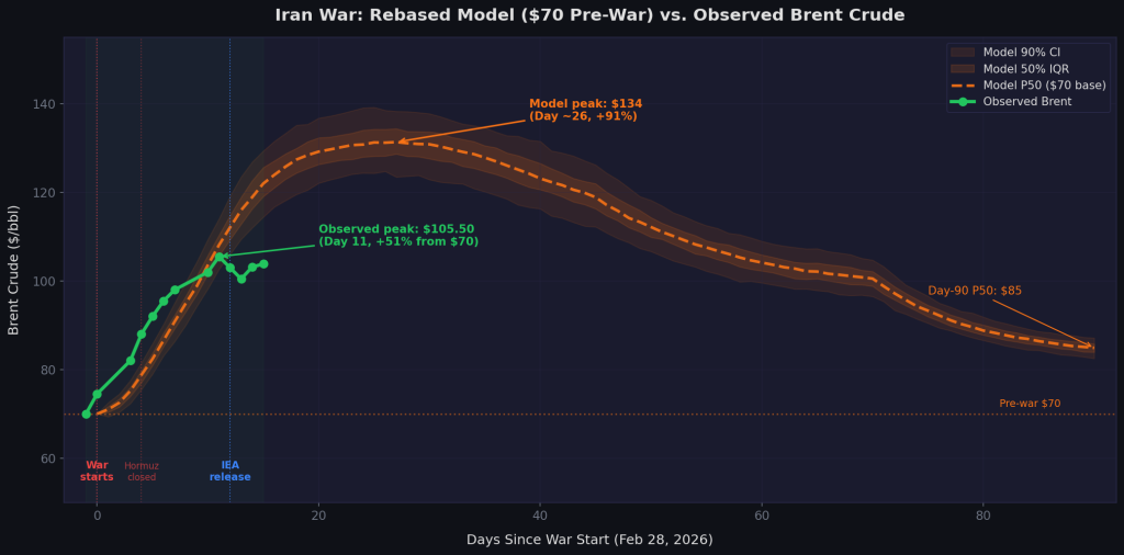 - Day 26-30 (late March): The model predicts peak Brent around $134. If the actual price reaches $120+ with Hormuz still blocked, the trajectory shape is validated.