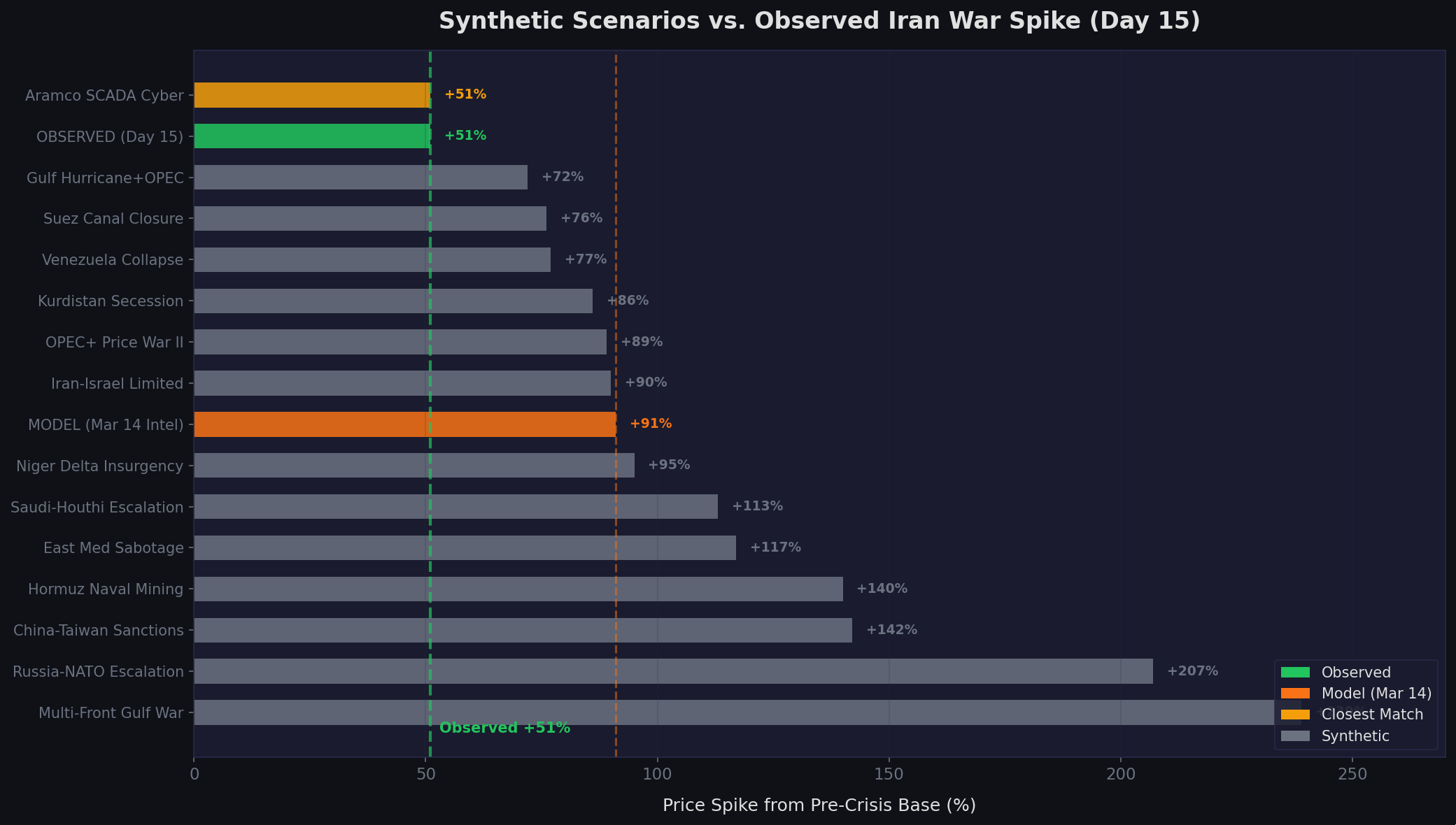 Figure 4: The 14 synthetic scenarios ranked by price spike magnitude, with the observed Day 15 spike (green, +48%) and March 14 Intel Calibrated model prediction (orange, +91%) marked.